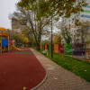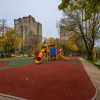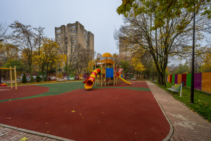 Ferestrele mari îți deschid privirea către copaci, culori tomnatice și un loc de joacă.